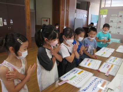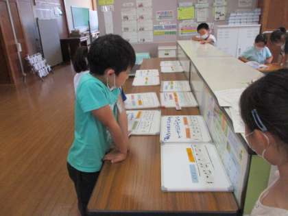 昨日グループで作成したリズムの書かれたホワイトボードを教室前に置いておくと、休み時間に友達とリズムをたたいて楽しむ様子が見られました。となりのクラスの友達も興味津々です。