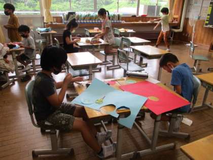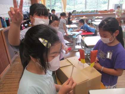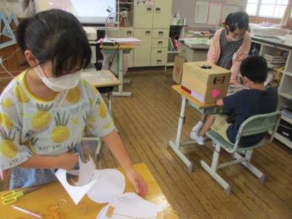 学級活動の時間に、クラスで考えた企画を進めています。グループごとにアイデアを出し合ったり、「もっとこうしたらいい」と準備物を改良したりしています。