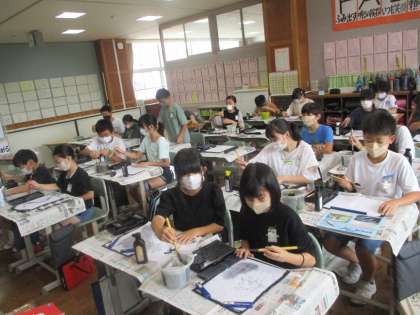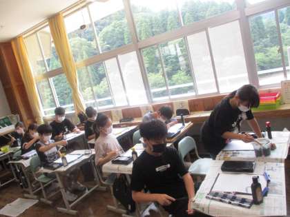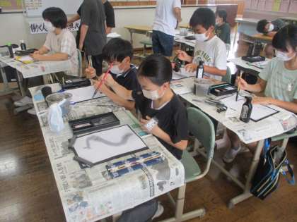図画工作科の時間に、墨と水を使って、思いのままに筆を動かして表現を楽しみました。墨を垂らしたり、飛ばしたりすると、様々な模様ができました。