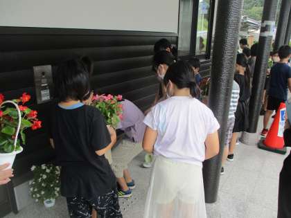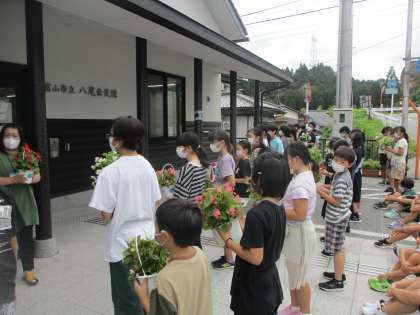 今日の3時間目に、人権の花贈呈式を八尾公民館で行いました。夏休みの間、大切に育てたベゴニアの花を6年生20鉢、4年生20鉢合わせて40鉢贈呈しました。植物を育てることを通して、相手を思いやる心を育んでいた子供たちでした。