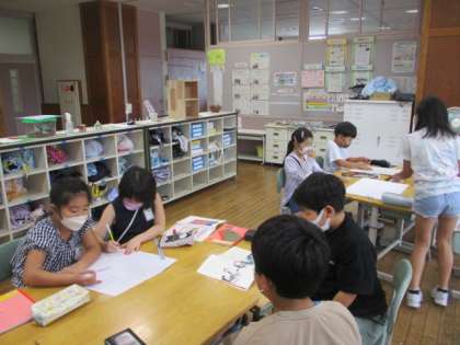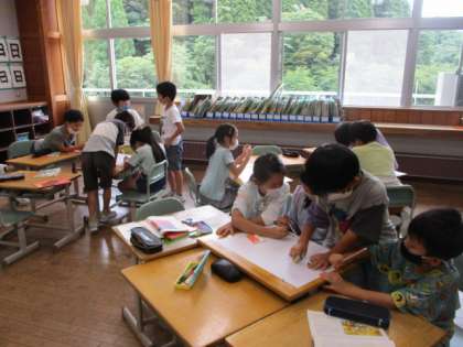それを踏まえて、グループに分かれてポスターを作っています。見る人に何を伝えたいかを話し合いながら、下絵を描いたり言葉を考えたりしました。