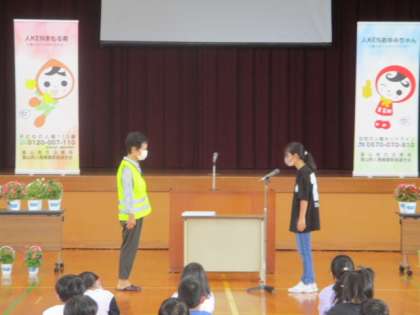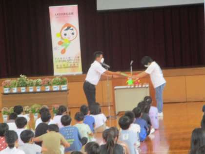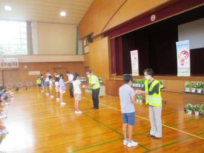 人権の花運動の終了式では、人権擁護委員の方が「これからも花と笑顔と思いやりがいっぱいになるようにしてほしい」とお話されました。それを受け、児童代表の6年生が「一人一鉢の栽培活動を通して育んだ思いやりの心を大切にしていきたい」と決意を語りました。