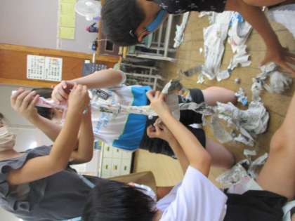 図画工作科「しんぶんしと なかよし」の学習で、グループ対抗新聞紙タワーゲームを行いました。