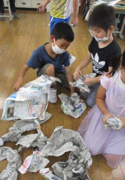 より高い新聞紙タワーを作るために、まるめたり、ねじったり、破いたり、時には自分に新聞紙をまとったり、グループの子と作戦をたてながら取り組んでいました。