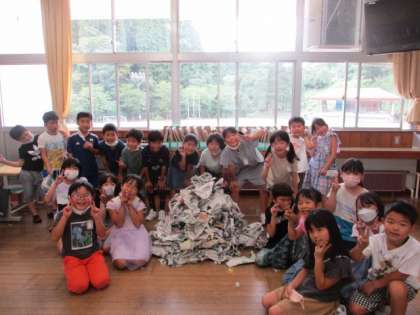 授業後の休み時間も子供たちは新聞紙に夢中です。担任が教室に入ると「じゃじゃーん!みんなで作ったタワー!80センチメートルだよ」と充実した表情で作品を見せてくれました。