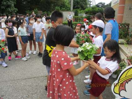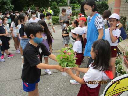 きれいな花を咲かせている人権の花を八尾保育所に届けました。花を渡した小学生も、受け取った保育園の子供たちも、とても嬉しそうでした。夏休みの間、大切に育ててくださりありがとうございました。教室でも引き続き、人権の花を育てていきます。これからも生き物や人に温かく思いやりの気持ちをもち続けてほしいです。
