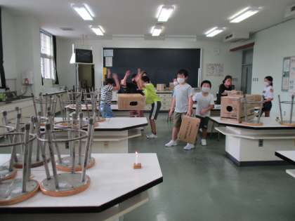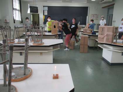 どのくらいの距離まで空気が届き、ろうそくの火が消えるのか、クラブの子供たちはさまざまに工夫をしながら、自分の空気砲を試していました。