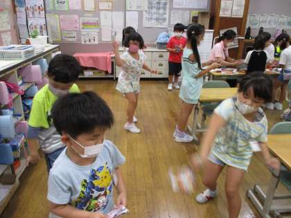 「投げる」の取組の一つに、紙でっぽうがあります。「パン!」という音をならすことができると合格です。