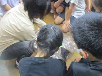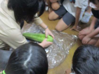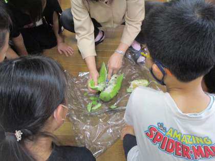 立派に育ったヘチマ。切って中身を観察しました。黒い種子や繊維質な中の様子などみんなで見ました。