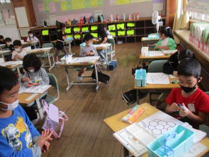 ほとんどの子供たちが、「初めて水彩道具を使う」とのことで、大きな意欲と関心をもって、学習に取り組んでいました。