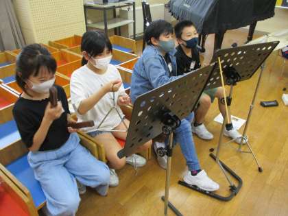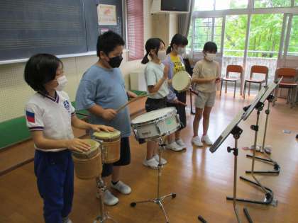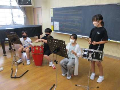 5年生の音楽では、グループに分かれて音楽づくりに取り組んでいます。担当の楽器やリズムを考え、何度も試しています。試しているうちに、楽器の音色を聴きながら、「やっぱりコンガにしよう!」「もう少し小さくしよう」などと声を掛け合い、取り組む姿が見られます。