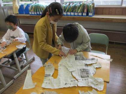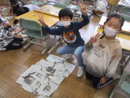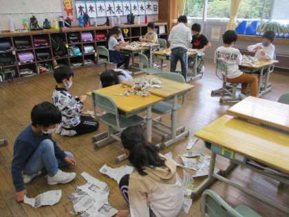 学活の時間に、新聞紙を使ったレクリエーションゲームをしました。ペアの子とあれこれと話しながら試しながら完成を目指して、友達と協力していました。早く終わった子は進んで周りの子にアドバイスをする場面もありました。クラスの絆がまた少し深まりましたね。