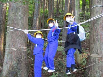 ワイルド遊びでは、自分たちでロープを張り、ブランコや綱渡り、ターザンロープを協力して作り遊びました。
