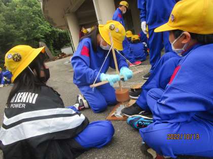 火おこしは、班の仲間と何度も挑戦しました。火が付いたとき、「やったー!」と大きな歓声が上がりました。