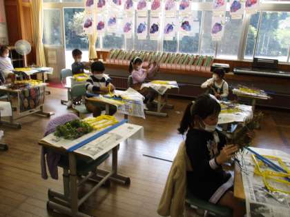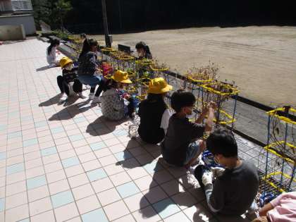 取ったつるは、輪にしてリース作りの土台にしました。子供たちは、この後、リースに飾りを付けることを楽しみにしています。