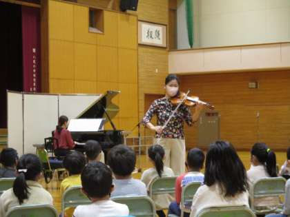 先日の学校コンサートでは、バイオリンとピアノの生演奏を聴きました。
