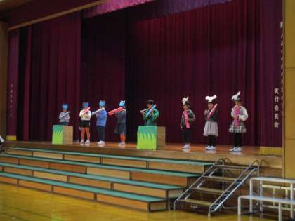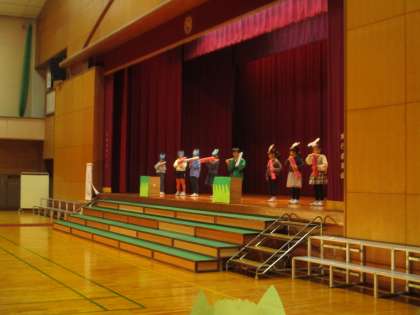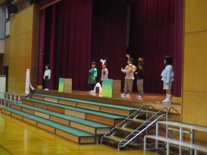 今回の発表では、国語科で学んだ「おむすびころりん」や音楽科で取り組んでいる鍵盤ハーモニカ、体育科で子供たちから提案された踊りの動きなどをベースとしてシナリオに取り入れ、練習をしてきました。