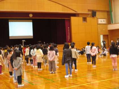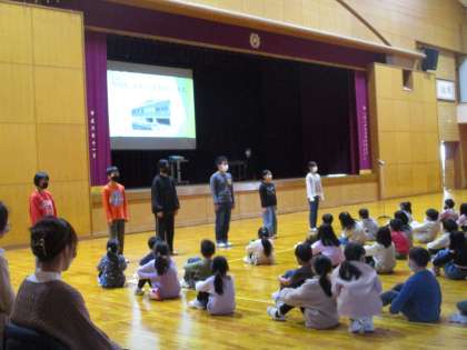 樫尾小学校のみなさんは、樫尾小学校について紹介してくださいました。八尾小学校の子供たちは、校歌を歌って紹介しました。