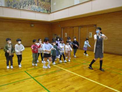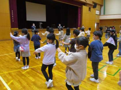 体育館で樫尾小学校のみなさんから樫尾小学校の紹介をしてもらい、八尾小学校は1・2年生の児童が八尾小学校の校歌を歌いました。