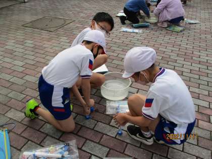 日差しの暖かかった2時間目に理科の実験をしました。空気の代わりに水を入れた空気でっぽうは、はたして玉を飛ばすことができるのか、予想しながら学習に取り組みました。子供たちは、玉がまったく飛ばないことに興奮していました。