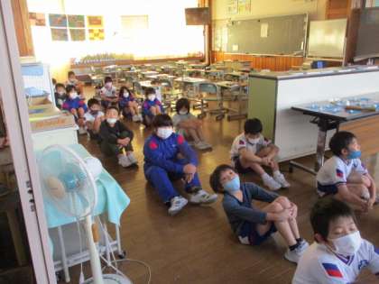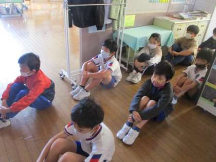 今日は土砂災害の想定で、避難訓練を行いました。どこへ避難するの?と尋ねると、すぐに答えることができる子がたくさんいました。放送中も、指先確認しながら静かに聞くことができました。次の放送を待つ姿も立派でした。