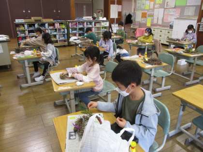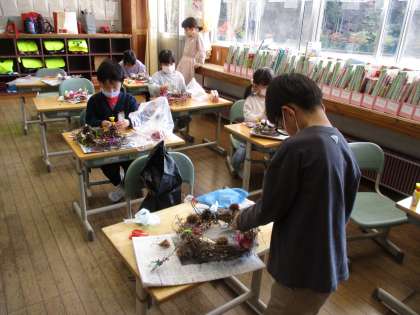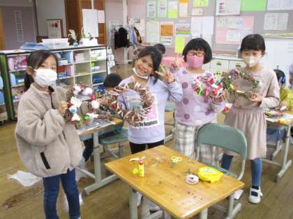 今まで大事に育ててきたアサガオのつるをリースの土台にしました。家から持ってきた木の実やリボンなどを付けて飾りました。