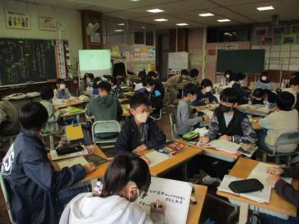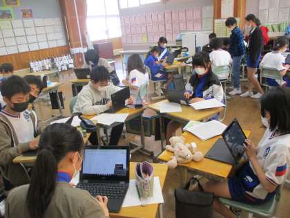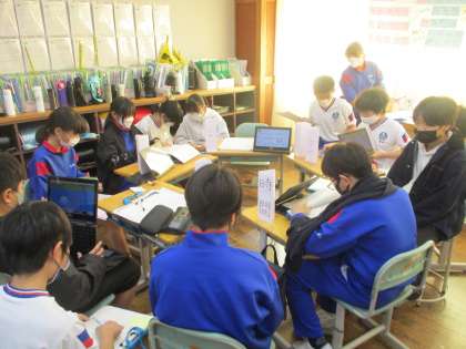 国語科「みんなで楽しく過ごすために」の学習で、目的や条件に応じて計画的に話し合う学習をしています。フラワー会議では、仲間のスライドを見ながら進んで質問をしたり、考えを広げる話合いと考えをまとめる話合いをつなげようと司会の仕方を工夫したりしていました。