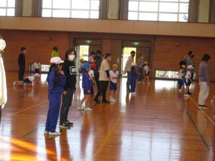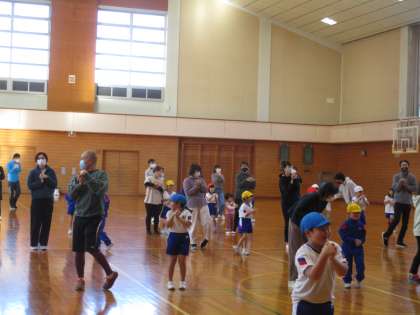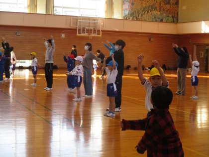 準備運動も親子でやると、楽しいですね。あちこちで笑顔が見られました。