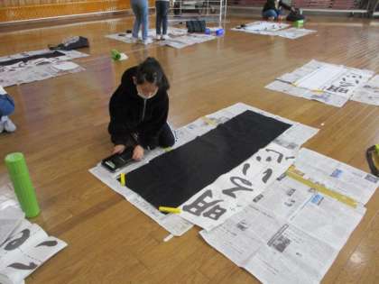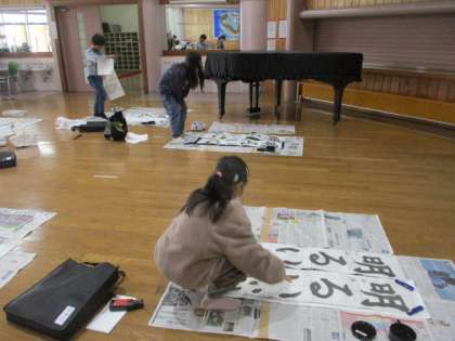 書写の時間に、書き初めの練習をしました。初めての毛筆での書き初めで、「明るい心」という字を書きます。子供たちは緊張しながらもわくわくしていました。準備の手順がたくさんありますが、てきぱきと動いていました。