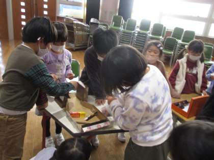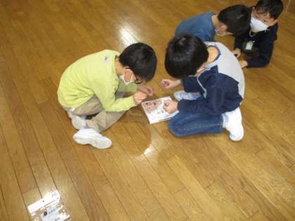 秋の実や葉で作ったいろいろなおもちゃを友達に紹介したり遊んだりしました。