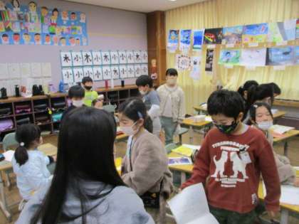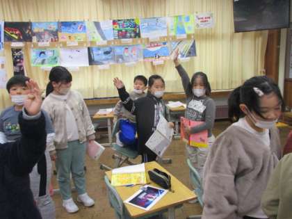 今日の国語科では、「三年とうげ」の話の最後の部分、「おもしろい歌を歌ったのは誰?」という課題に対して、理由も考えながら答えを出す活動を行いました。同じ考えの友達がいないか、理由は同じかどうか、みんなで伝え合いました。