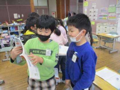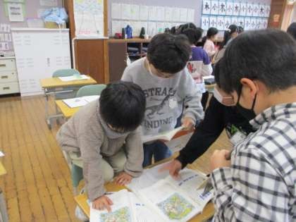 国語科「たから島のぼうけん」の学習に入りました。物語導入での設定を考えた後、たから島の地図を見ながら、島のどこに船を着けるか、その理由はどうしてか、を伝え合いました。
