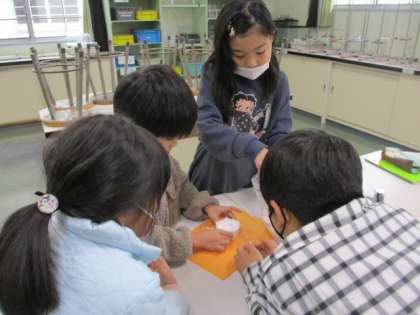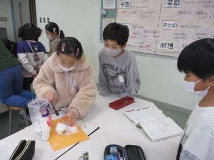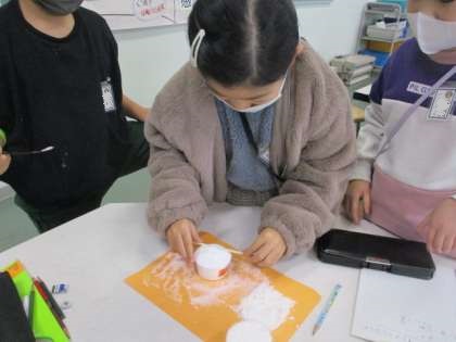 今日の理科では、見た目がそっくりの塩と砂糖の重さを量りました。同体積にするために、カップにすり切り入れたあと、電子てんびんで重さを計測しました。協力しながら、実験結果をまとめることができました。