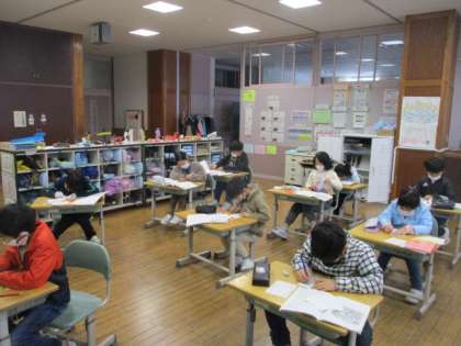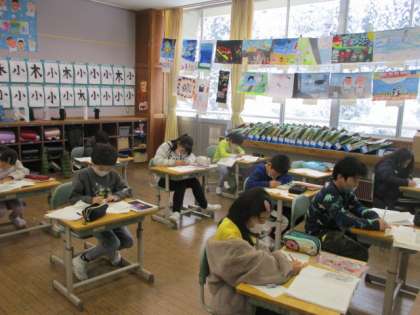 いよいよ「たから島のぼうけん」の学習も後半へ突入しました。今日は、進む順番ごとにお話を作りました。物語の中に入り込みながら、真剣な表情でお話を書いています!