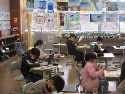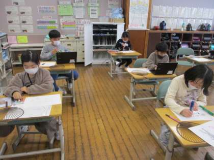 総合的な学習の時間では、引き続き桑の枝を使ったうちわを作っています。早く作り終わった子は進んで友達に声をかけてくれました。