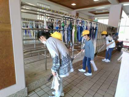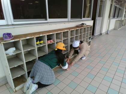 下足箱も掃除しました。一人一人の下足箱を掃除した後、下に落ちた砂まで拭き取ってくれています。また、傘掛けの下もほうきで掃いています。