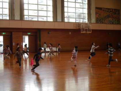 ハンカチ落としと鬼ごっこの後は、体育館に移動して行いました。体育館では、子供たちが「横のドア、換気のために開けておいたよ」など、気づいたことにてきぱきと取り組んでくれました。