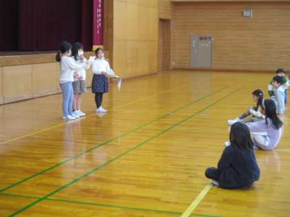 最後にドッジボールで楽しんだ後、終わりの言葉担当の子供たちの発表です。「今日の集会はどうでしたか?」と尋ねる言葉に、たくさんの子供たちが手を挙げて感想を発表してくれました。最後に発表してくれた感想「みんなで遊べて楽しかったです」という言葉が、集会全体をしっかりとまとめてくれました。
