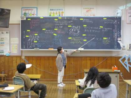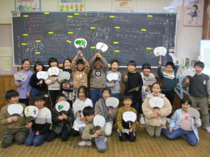 今日の総合では、2学期の学習を振り返って、自分たちが見つけた「八尾町のすてき」や八尾町への思いをみんなで伝え合いました。八尾町の文化を世界中に向けて発信したい、未来の世代につなげていきたいなど、それぞれの強い思いがあることがわかりました。桑の枝を使ったうちわを持ってパシャリ。