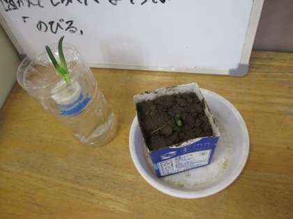 昨日、学級にやってきた植物がもう1つ見つかりました。「水で育てるのと、土の中どっちが大きく育つのかな?」という子の疑問から、また観察が始まりました。