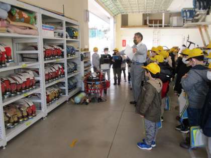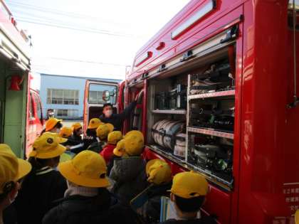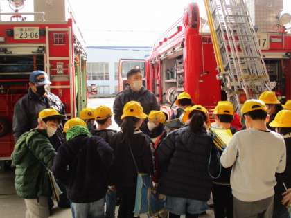 消防車はポンプ車を見せていただきました。2つのポンプ車を見比べながら、違いと共通点を見付けていきました。どの消防車にも積んでいる必要な道具を丁寧に説明していただきました。教科書では分からないことを実際に見ることで、多くのことを学ぶことができました。八尾消防署の皆様、ご協力いただき、本当にありがとうございました。
