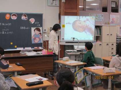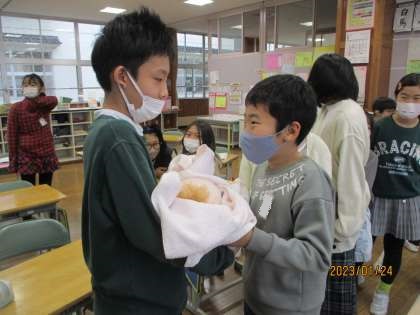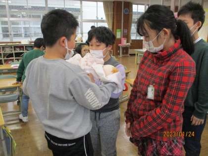 話し合った後、3000グラムの赤ちゃん人形を抱っこしてみました。思いの外,重くて、ずっと抱っこするのは大変なのだなと実感していたようでした。みんな、照れながらも「ほかほか」笑顔でした。