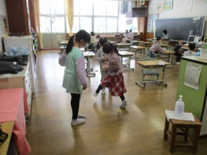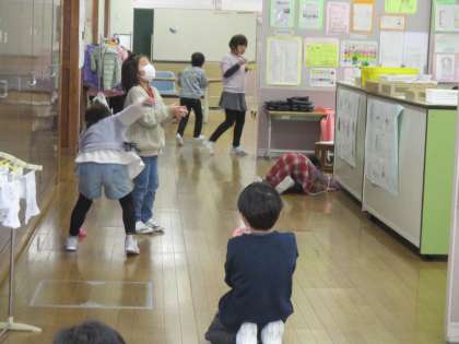 写真は、積雪を心待ちにしていたように、寒い中、「グラウンドに遊びに行っていい?」と、元気に飛び出していった子供たちの様子、そして、生活科で取り組んでいる「あそび名人になろう」で体験したお手玉やこま回しなどに熱心に取り組んでいる様子です。「2回連続で(こまが)回った!!」「(お手玉で)○○の技ができた!!」など、何かできるたびにうれしそうに、元気いっぱいに教えてくれました。