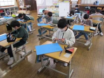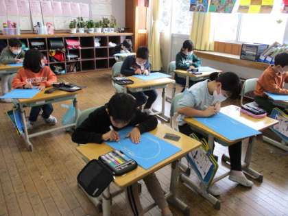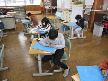 今日は、初めて彫刻刀に挑戦しました。彫刻刀の名前や使い方を確認し、練習をしてから、いよいよ彫っていきました。みんなドキドキしながら彫り進め、丁寧に描いた下絵を真剣に彫っていました。一生懸命彫りすぎて、手が痛くなった子もいましたが、怪我なく安全に彫ることができました。片付けの時間を伝えると「もっと彫りたかったな」「うまくできたよ」という声が聞こえてきて、みんな満足した表情でした。
