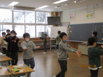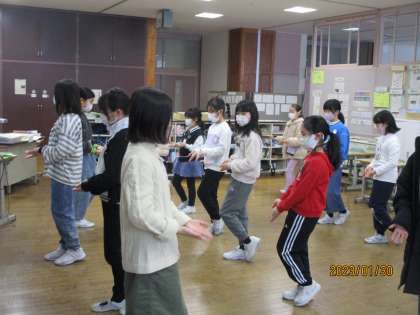 1年生は、6年生の代表の人が、2年生は5年生の代表の人が、3年生は、4年生の代表の人が、踊りを教えに来てくれ、踊りの練習をしました。上学年は、みんなで輪になって踊りました。
