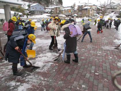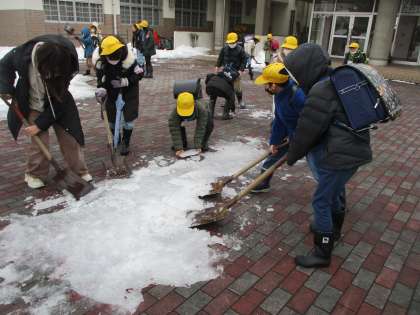 下校時には、朝できなかった除雪を行いました。担当ではない子供たちも,率先してスコップを持ち、堅くなった氷を取り除いていました。