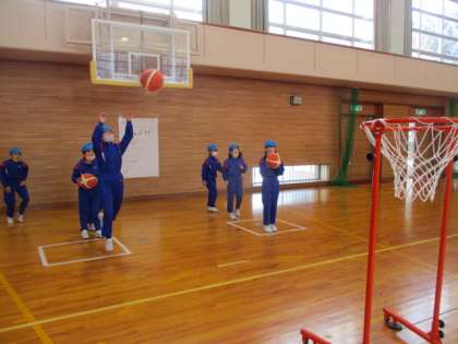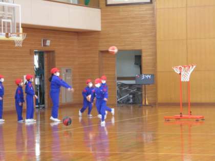 今日の体育科では、バスケットボール型のゴールを使ったゲームの練習をしています。狙った場所にボールを投げることに、少しずつ慣れてきたようです。