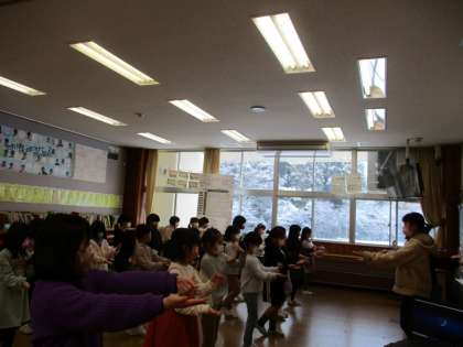 今週はおわらの練習をしています。初日は5年生さんの踊りを見ながら動きを確かめました。