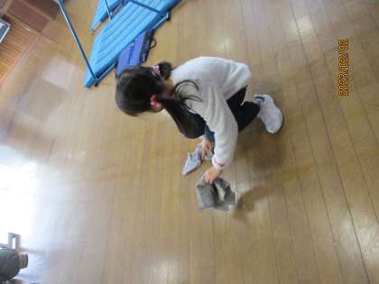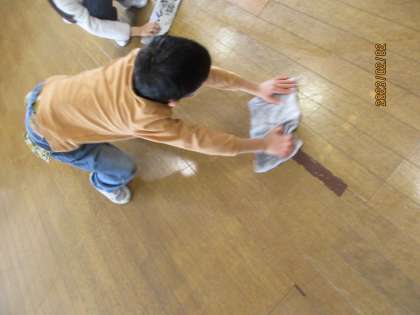 図工の後に床が汚れていることに気付いたおたすけレンジャーが雑巾拭きをしてくれました。その様子を見ていた他の子供たちは「ありがとう!」と言い合っていました。