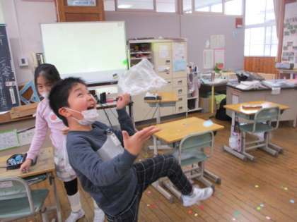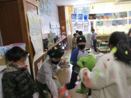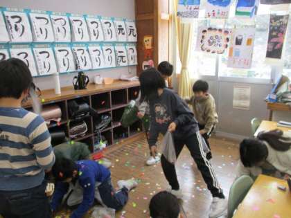 今日は、節分でした。節分や立春のお話をしてから、学級でもっとよくしたいところ、自分の中の直したいところをみんなで出し合って、鬼退治をしました。豆の代わりの色紙を、見えない鬼に向かって撒きました。